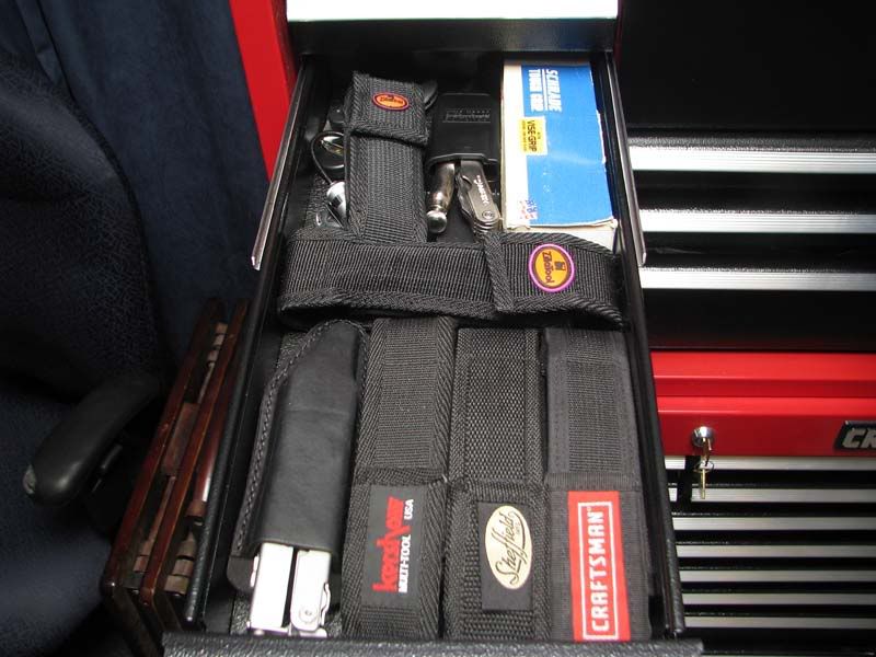 Chako,Something like the one you got I have been looking into myself. Though I'm trying to do it on the cheap and in something other than red. Not having much luck at the moment.Currently part of my Knife/SAK/MT collection rests in a couple of these I have.......(Image removed from quote.)........but the two I own are full. I need me something like that Craftsman.2xTap