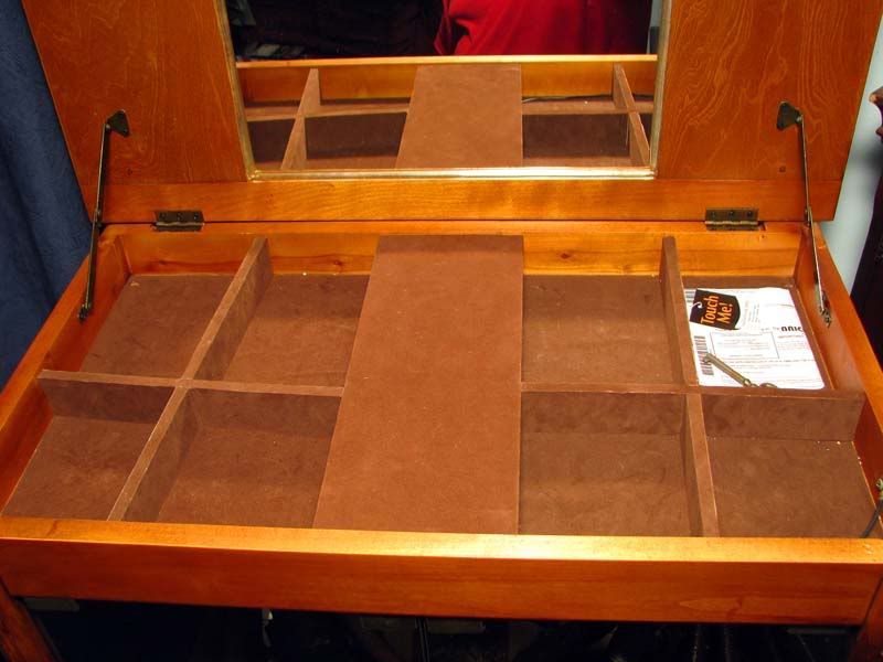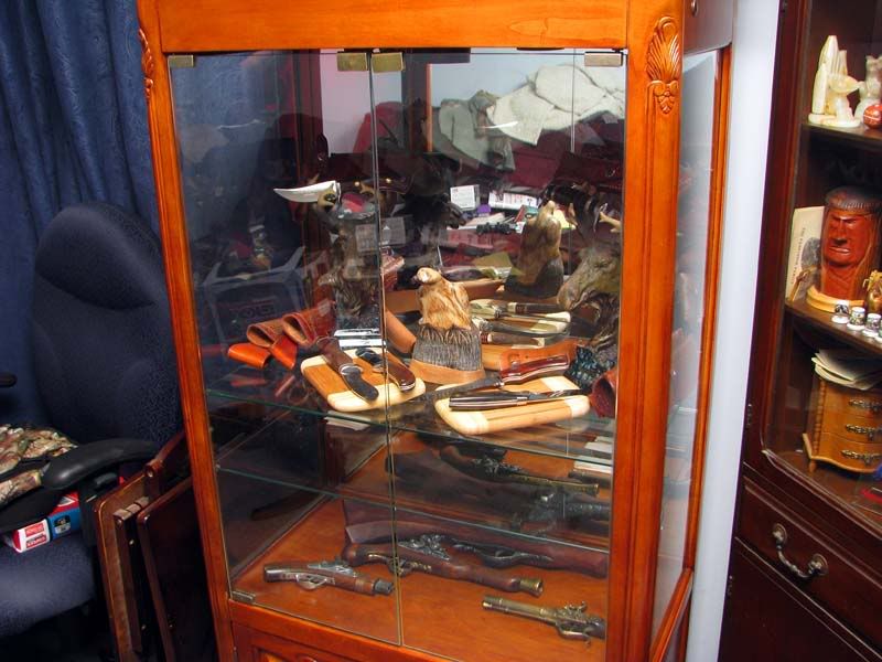 Here is the curio cabinet now in the living room. I cleaned out the 3 drawers of sheaths and boxes. The idea is to put all that stuff into the new storage cabinet once It arrives. So now I have 3 nice felt lined drawers for special items under the glass display.