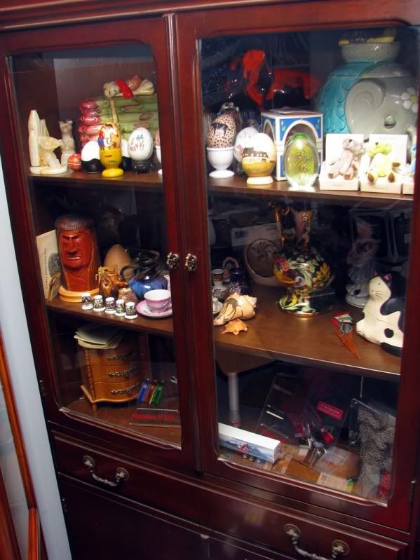 Here is the corner unit. Most of this stuff is my late mothers. Her egg collection, the cookie jars I would raid when I was a child, etc. I did purge, so now I have some room here.