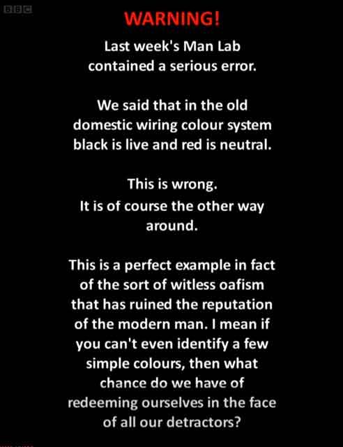 Quote from: Neil on November 02, 2010, 09:51:33 PMSlightly disconcerting that he can't get the old wiring colours right though Though as I pointed out to my wife, most people are not confident wiring a plug as everything is moulded these days and that's a very good thing considering some of the hack jobs you see on old equipment!Yup, I waited a few seconds to see if he'd correct himself and then, nothing.
