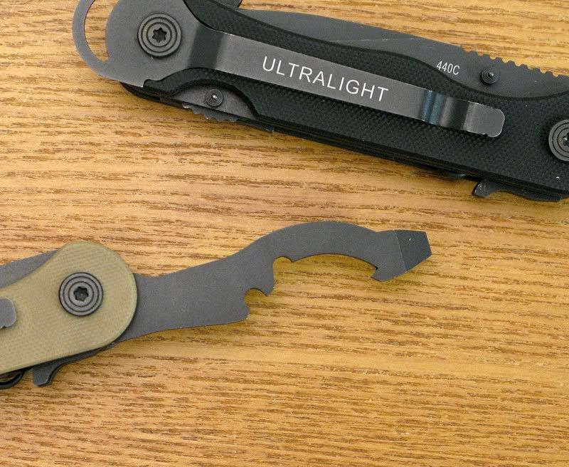 The Ultralight is basically a two-layer folding knife, with two "blades" or "tools" built into each layer. The layers are sandwiched between scales of G10 material, and these G10 scales have cutouts in them that contain additional features like a pocket clip, lanyard attachment, and a removeable double-ended wrench. Future variations will see a removeable prybar tool and/or can opener replace the wrench, and perhaps a glass breaker in place of the lanyard ring. The possible variations are endless.