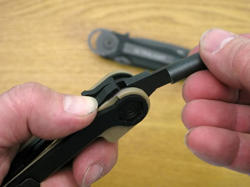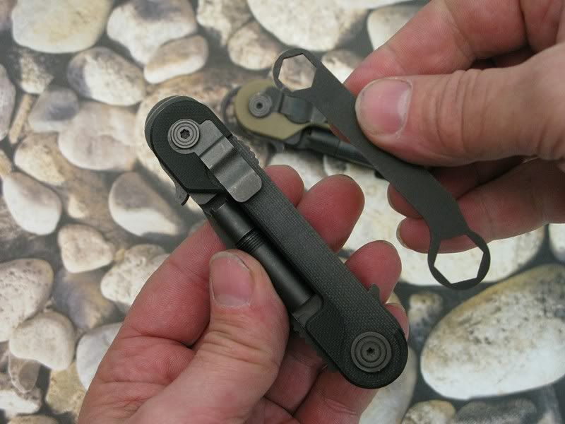 On the other side, the scale is contoured perfectly to hold a removeable double-ended wrench. This wrench features 3/8 inch and 1/2 inch openings, specifically for AR15/M16 rifle scope and mount fittings. As was mentioned before though, don't be surprised to see a removeable multi-function pry bar on future EDC models.