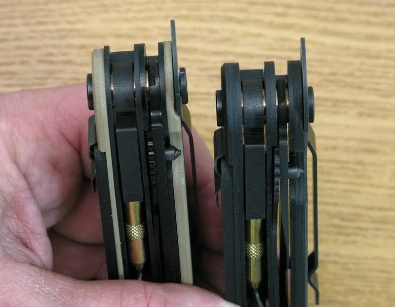 Speaking of locks, the spine lock mechanism on these Ultralights is just about the coolest thing I've played with in a long time. It consists of a rocker switch (machined from billet of course) which is spring loaded and engages in a notch cut into the pivot of the particular blade or tool (also machined from billet by the way)