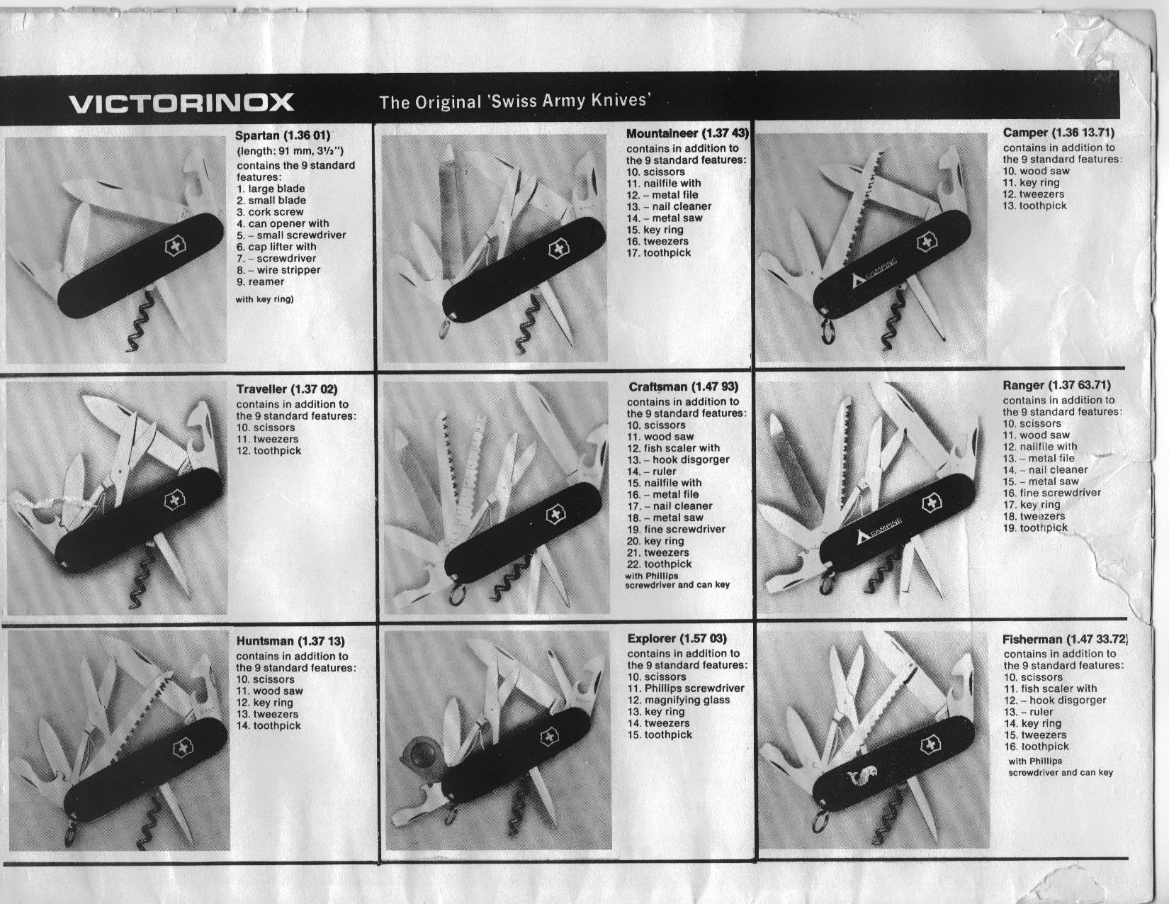 So, what SAK is in the image above? It looks like 4 layers and I can see blades, scissors and openers. It's older because the keyring is on the blade layer, not the openers. But the tools don't seem to be in the right order. The fourth layer (looks like a file or a saw, but maybe a fish scaler) should be between the blades and scissors - but it's between the scissors and openers. Did Victorinox change the order of the layers over time?Actually, looking at the catalogue page below, it's probably a mid-eighties Huntsman:(Image removed from quote.)