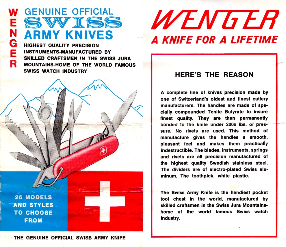 This from the SAK Owner's Manual:  "In a brochure from the 1960s Wenger says that theirs was the first company to make a plastic handle on a folding knife - a claim also made by the American cutlery company PAL."