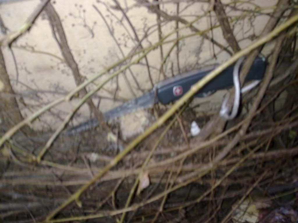 Today, a rainy and cold day, my wenger sneaked out and hacked some 1 inch branches from that vine, managed to take a blurry pic of it before calling it back inside  :D