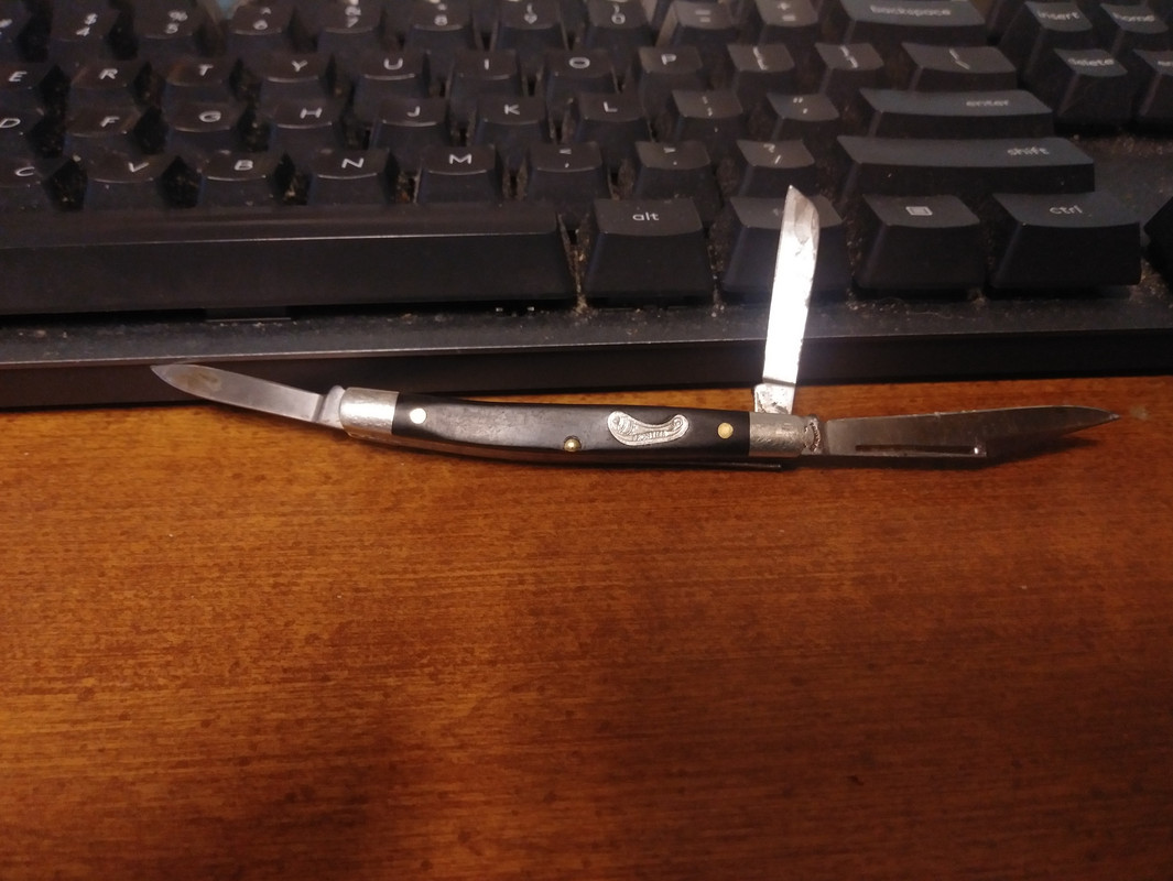 I THINK this was originallly an Ulster pattern; as it's slightly longer than, but skinner than a 104OT. It is put together with Swinden construction. Frontiers are complicated as some were built in the Imperial factory in RI using old Schrade and Ulster tooling. Some were built by Schrade, and others Camillus. Albert Baer owned all three companies at the time.