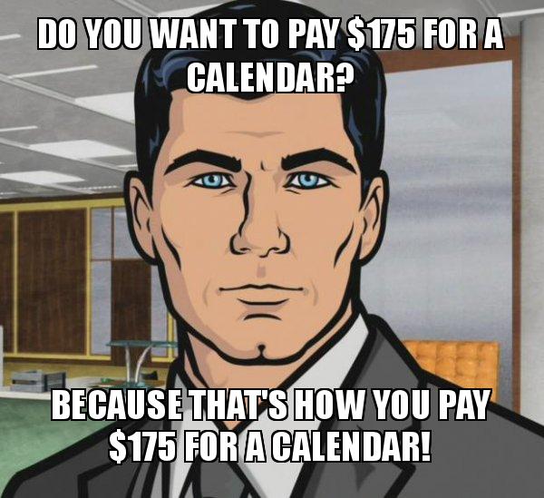 Quote from: NKlamerus on October 04, 2016, 03:19:24 AM13 photos? I think we could just as easily have a photo for every day. PLUS a large cover per month lolWe could, but would you want to pay $175 for a calendar? Because that's how you pay $175 for a calendar.Def