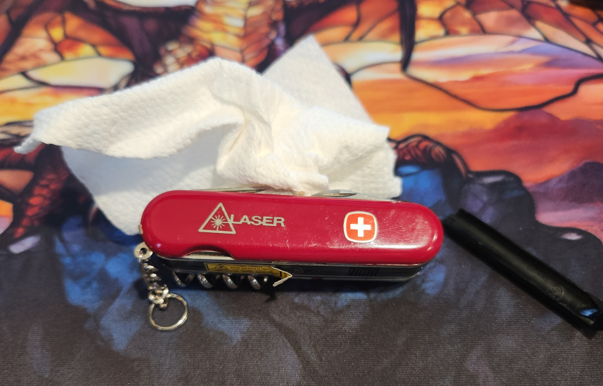 I was able to clean a lot of the corrosion off the laser module, by scrubbing it with a baking soda mix, brass bristle brush, and 400 grit sand paper. The lens shows a bit of damage when you look at it up close but it doesn't seem to affect it past 2ft. I'm pretty happy with the results. Not too bad for a $40 investment on an unknown condition knife.