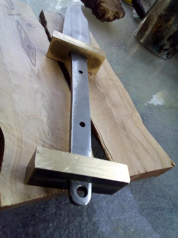 Thanks everybody I learned an important lesson making this knife, it's not something I'd normally have made, but everybody that seen it loves it.My one big concern was weight and balance thanks to all that brass, but despite having a nice thin blade the knife balances on the front guard I posted these 11pm....until I couldn't see straight.......I'll try to get the last pics up tonight. It's 99% done and my Dad has started with his sheath.......he's my new leather man Thanks again for the compliments and positive feedback.....very much appreciated Quote from: gerleatherberman on November 30, 2018, 04:10:31 AMAwesome work Gerhard! Sign of a good blacksmith? Forging bare foot. perhaps a sign of a stupid blacksmith.....no I don't....just take photos bare feet