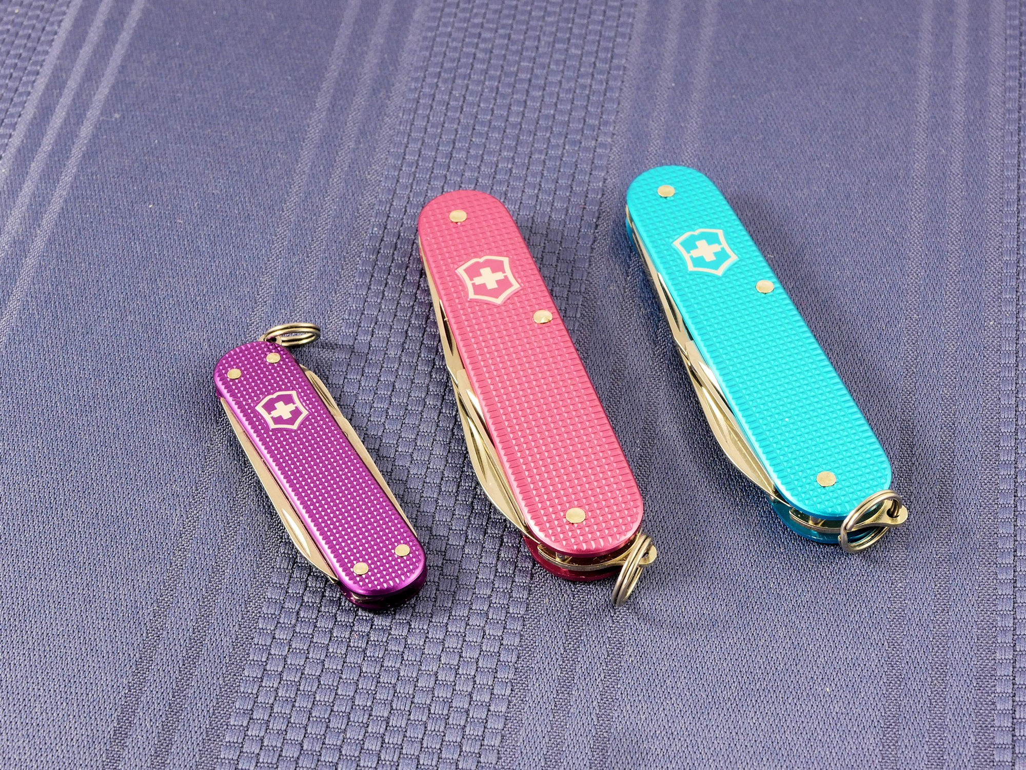 Up for sale for $75 is a lot of 3 Alox SAKs. One is the limited edition Classic SD Orchid Violet. The other two are Cadets, but I cannot remember the specific colors.