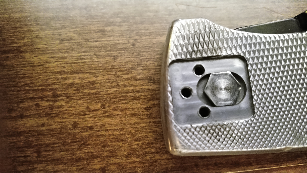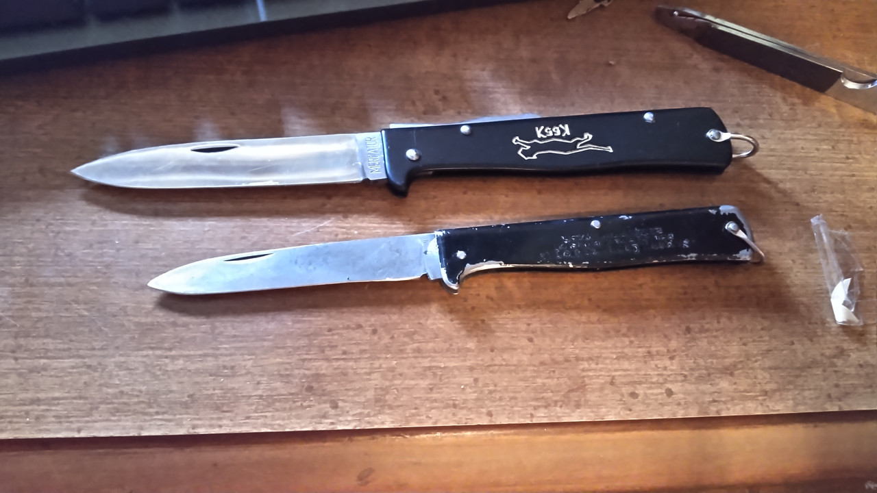 Started with Schrade's 6OTX. This was produced in 2003 only, and was to be replaced in 2004 by the 7OTX, which had a more sensible looking blade and thumb studs instead of the thumb disk. Schrade beat Buck to the punch with a lightweight, slim model based on a traditional brass-frame lockback folding hunter by 15 years. But, the blade shape is awkward. My plans at the time I bought it were to strip the heavily worn coating and use some red enamel engine paint to redo the handles.