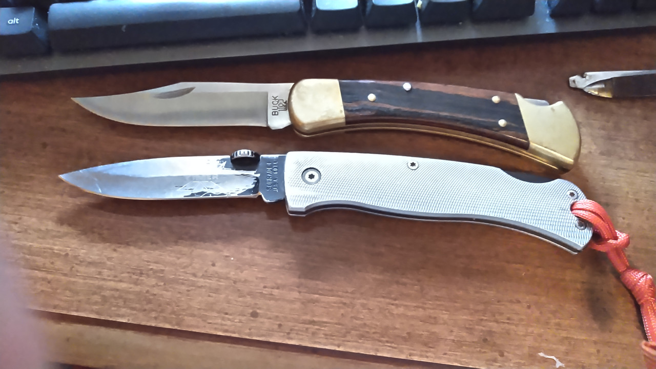 Modern (Otter Messer production) Mercator K55K "Black Cat". I have an older, smaller slipjoint version, and to my amazement, the new one is made just as well.  With a 3.54" blade, it's a tiny bit smaller than the 110; plus it's about 70 years older, having been introduced in the 1890s. It is slim and lightweight (despite the stamped steel handle), as well as comfortable. The Buck 110LT and 110LT Slim Select always just felt awful in hand. They were comfortable, but not the same balance or feel. The Mercator still feels well balanced, is strong (lockback and 3mm blade!), is slim, and is carbon steel. Perfect for a work knife and lightweight, but hard use (and affordable!) EDC that doesn't weigh me down.