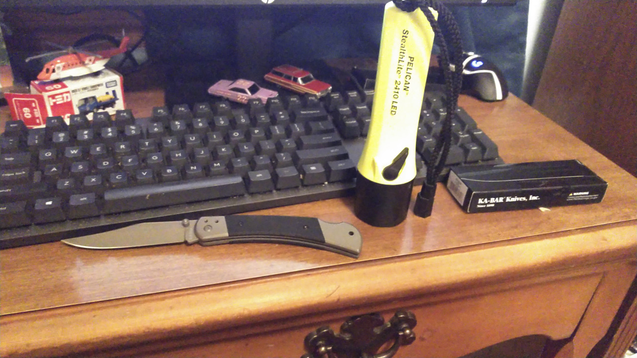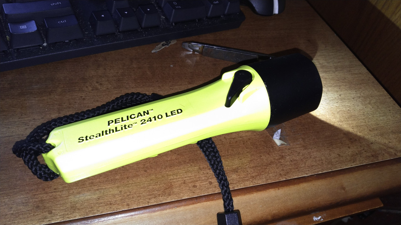 I've always wanted to try a Pelican flashlight, as I heard they were hard to break. Recently, they introduced them with decently powerful LEDs. I have a weird thing for industrial flashlights, especially USA-made ones. They are usually more durable, and brightly colored. The incandescent are cheap, but dim and two hour runtimes with D-Cell batteries and constant replacement of PR6 lamps run into money.  The Stealthlite 24.10 was about $45; and that's the cheapest I've seen. It's 183 lumens, and runs for just under six hours. While the Mini Maglite Pro runs for just half that, the output is double, it's also American-made and HALF the price.  But then again, I'm guessing this is partially more expensive as it's designed to be "intrinsically safe".  This will be my working flashlight, and it will see a lot of hard use. I prefer a larger, high-vis light. I also recently picked up the Mini Maglite Pro, which is also to be used as a worklight. Many of my multitool sheaths are designed to fit a Mini Maglite.  Little pocket-size lights are easy to lose. I thought I'd lost my Olight S1R 2 trying to get a garage door with a broken spring open, and I finally found it two weeks later (when the company that put the door in got around to fixing it after sitting on the replacement spring for a week) sitting on the bed cover of my truck.  My i3EOS Desert Tan is still missing. Big ones are harder to carry, and a full-size Maglite is insane to carry around, but something the size of a Mini Maglite or this Pelican is just fine.