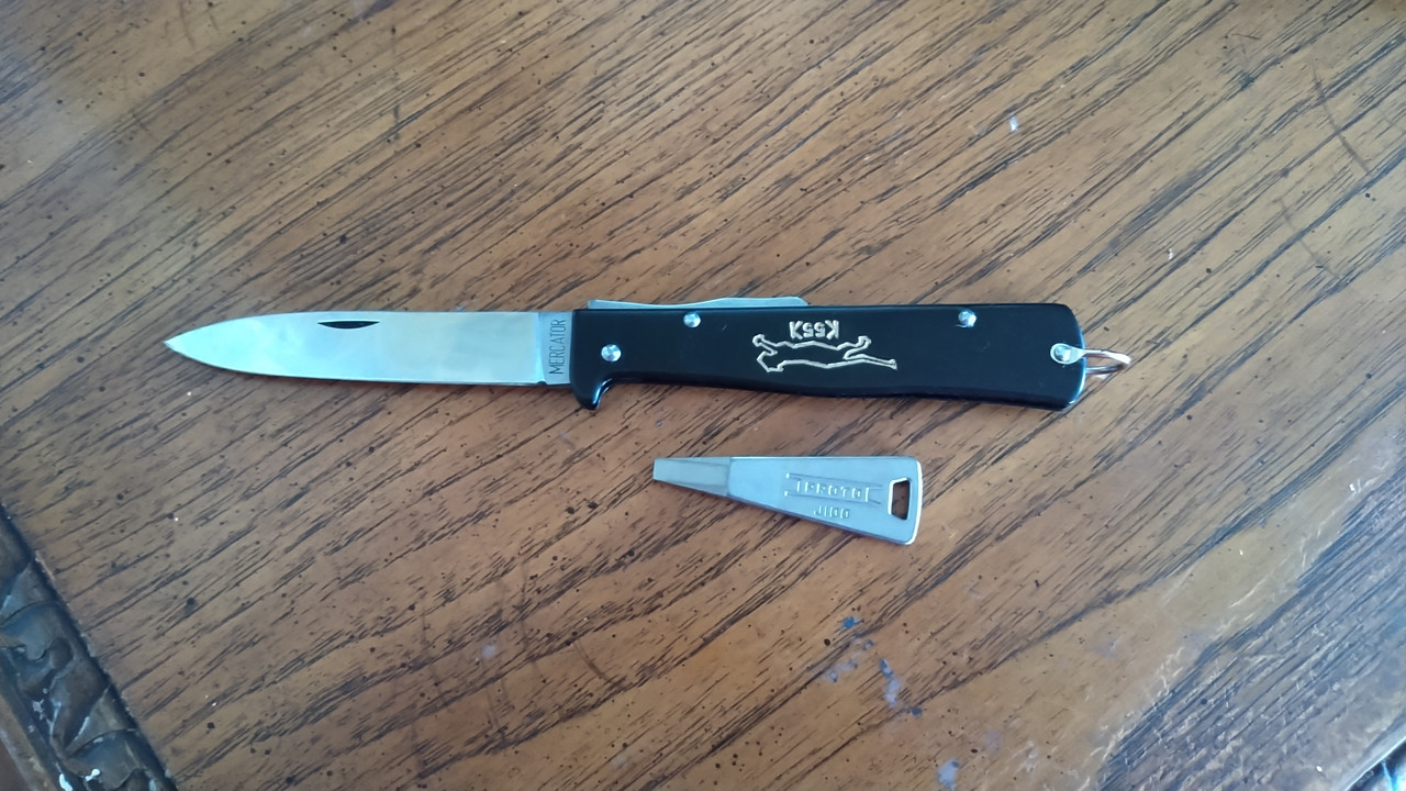 The small Mercator probably dates to the 1950s. The tang stamp is "KAUFMANN SOLINGEN", not Mercator.  Hy. Kaufmann was the original manufacturer from the 1890s up through the 1990s; when Otter Messer bought them out. The knife advertises Samson Cordage Works's Bellingham, WA office. In the 1980s, they moved the HQ from MA to the Bellingham office.  They're still in business to this date; and seem to be one of the major producers of synthetic rope. I actually wanted one of these instead of the big one, but the "small" model mostly just seems to be produced for European markets, as it's still complaint with most European blade laws.  It's not easy to find in the States, while the K55K is a common item.