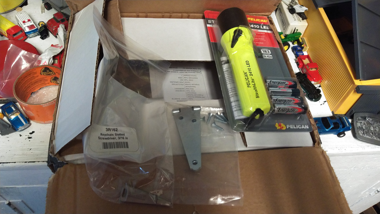 I wanted to try the Proto J-100. They've been making this version for about 5 years. I didn't know they even made them until about 3 years ago, when I came across them in a Proto Tools catalog I'd had for three years before that (and mostly just used to order handmedown sockets or wrenches I'd lost). Our local Fastenal, the Proto dealer for where I live, would've had to special order it, and that was expensive. Grainger had them back then, but showed a much cheaper, older design (between the classic 1950s J-100 that ended production in the 1990s and this revamped version was an old, ugly, and cheap Stanley design they marketed as Proto). They only updated the photo last year. They were $7 each, but I had to pay a lot of shipping. I needed some hinges to repair a barn door, and I'd lost my safety glasses (that was shipped separately); and I wanted to try a LED Pelican flashlight. So, I waited a couple of months and did a combined order.