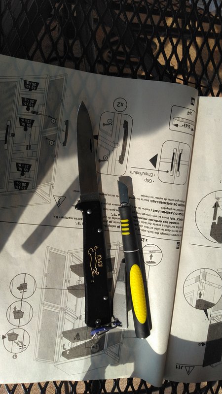 Day 25. Assembled a large plastic cabinet. I really don't get it--I spent $140 on a cabinet, and none of the heavy flashing was removed. Had to use a #7 blade on my craft knife plus the Mercator to get it off. I used the Mercator for the thicker chunks, hobby knife for the detail work.