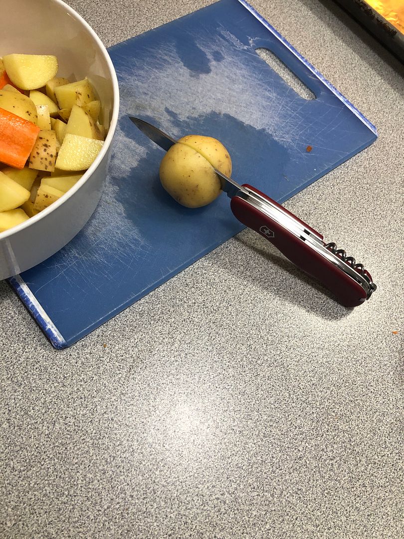 Thursday and Friday are my nights to prepare dinner as we shuffle the dinner prep between 4 of us.  Prepping potatoes, carrots, and Brussel sprouts for a veggie dish to go with a pork loin tonight.