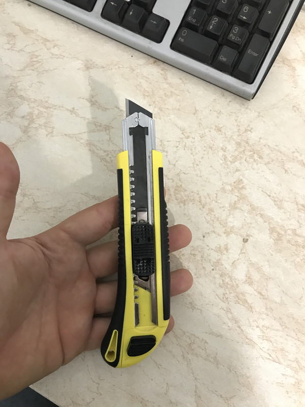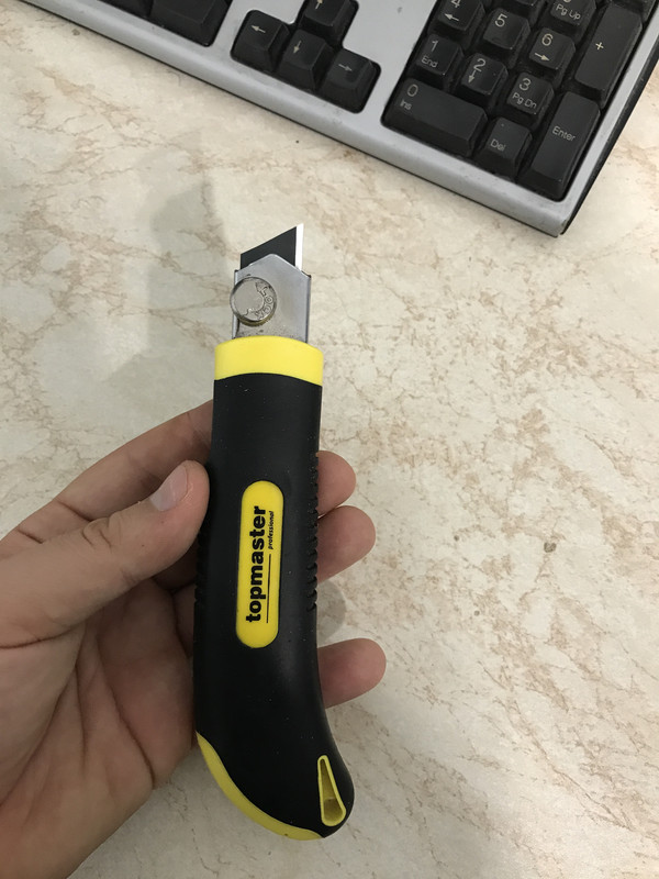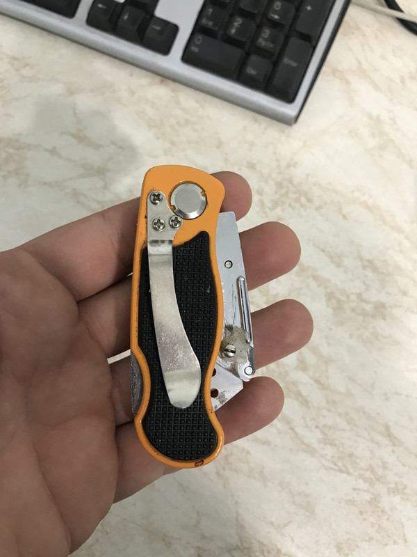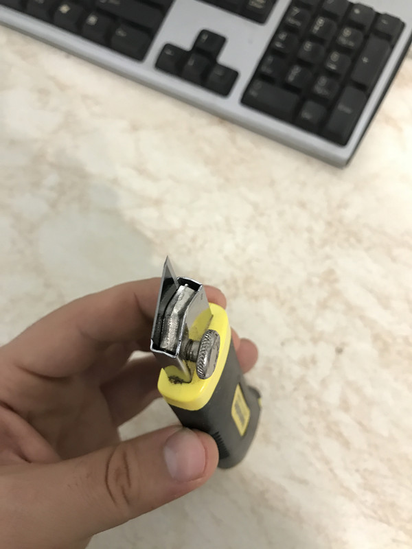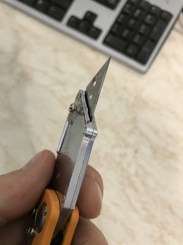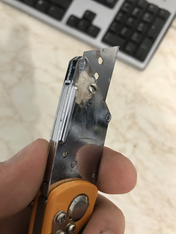 And I thought how great it would be if I could have a decent folding utility knife. So I got a few but sadly all of them have quite the play in the blade. And I don't mean the folding part, I can deal with a bit of that. I mean the part which holds the blade doesn't hold it steady, it rocks in all directions. The biggest disappointment in that regard was the Milwaukee fastback as it was worse than cheaper ones. I did tune one of the cheapos so there would be a screw pushing the blade down and it works decent, allowing no movement in the blade. Only downside is if I turn the bolt just a bit more than it needs - it pops the nut I've glued in the bladeholder out . Here are some pictures, the white stuff is superglue + baking soda
