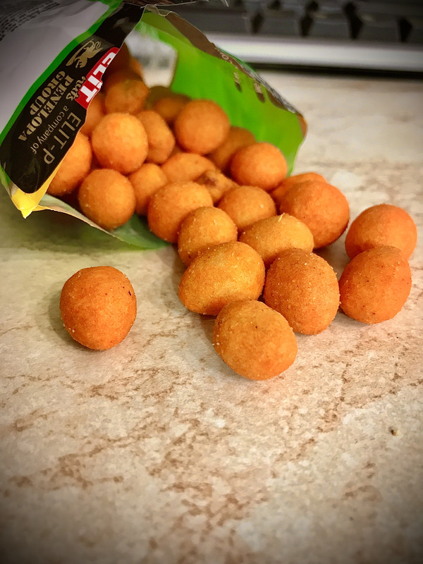 Opened a bag of garnished peanuts. I hate all kinds of plastic packages as they always split not like they are supposed to and quite often there are nuts all over the place. That's why I cut them all.