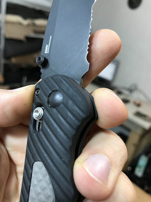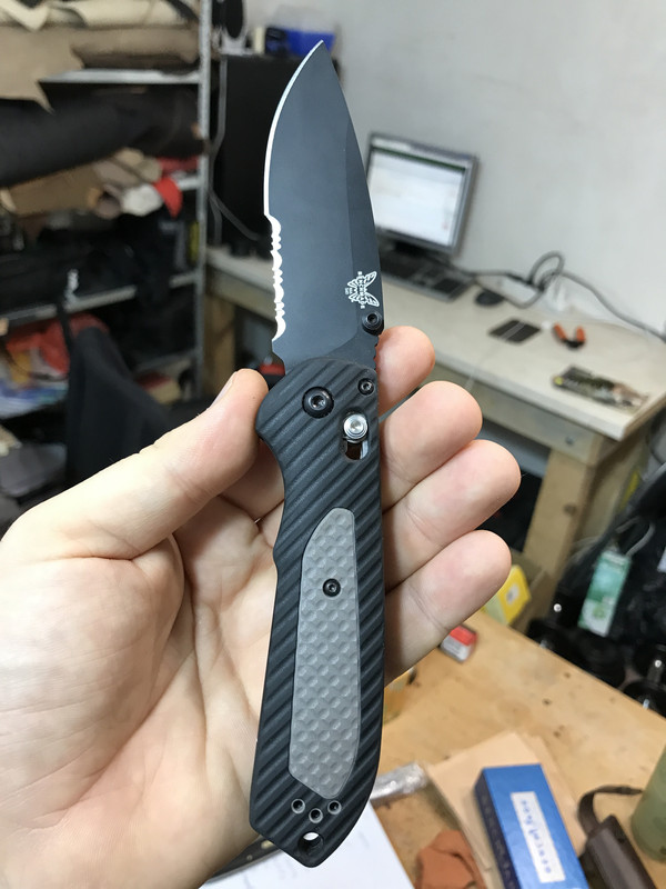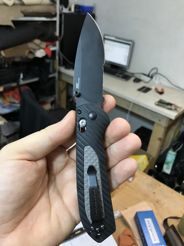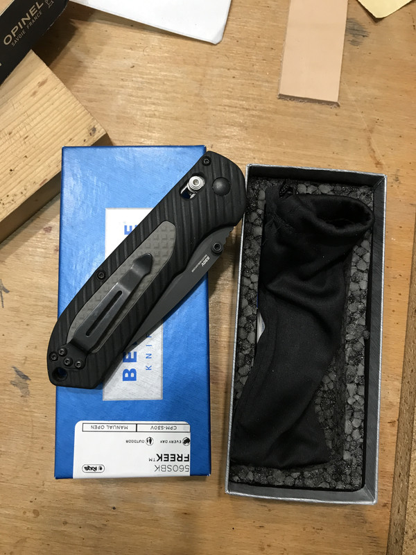 1/ Benchmade 560 Freek S30V, partually serrated. Carried, slightly used - apples and such, never sharpened. Might been stropped but I can't recall. No scratches in the blade. Slightly off centered blade but it does not rub in the handle. Small rub on the rubber handle, in front of the axle - it is visible on one of the photos. It occurred because I made a moulded leather sheath for it, it was a bit tight so I decided I should take the knife in and out few hundred times so it could brake in. But the backside of the leather managed to rub the handle a bit. Trade value 150 E