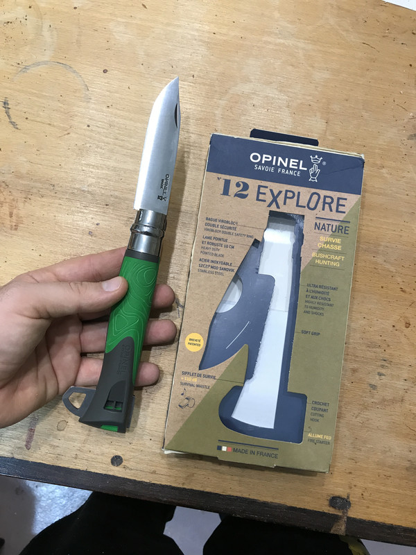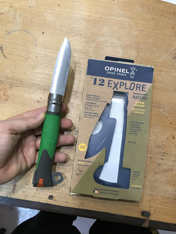5/ Opinel 12 Explore. Never carried, not sharpened. Ferro stick struck few times. Trade value 30E