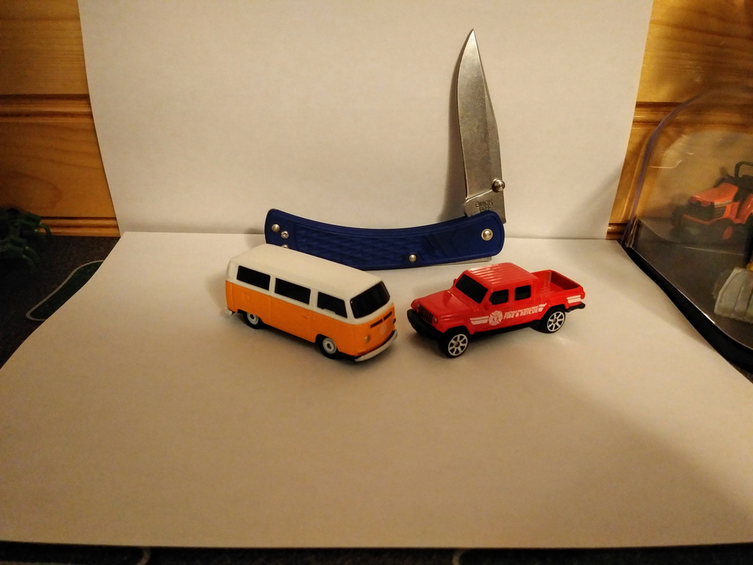 Buck says it is “O.D. green canvas micarta”.  My copy does appear green to my eye, but significantly lighter, with a sort of faded or washed-out appearance, like an old pair of jeans.