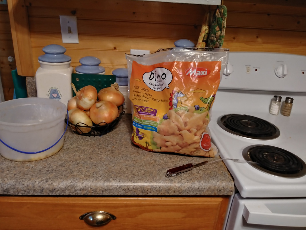 Opened a new bag of chicken nuggets.  Yeah, they're dino nuggets aimed at kids, but the bag was $2 less for the same amount of Tyson nuggets I prefer.  They're not that bad (and nothing can be worse than the Food Lion own-brand stuff, which always cooks up as mush), but it's a pain in the rear getting dino shapes symmetric on the plate I microwave them on.