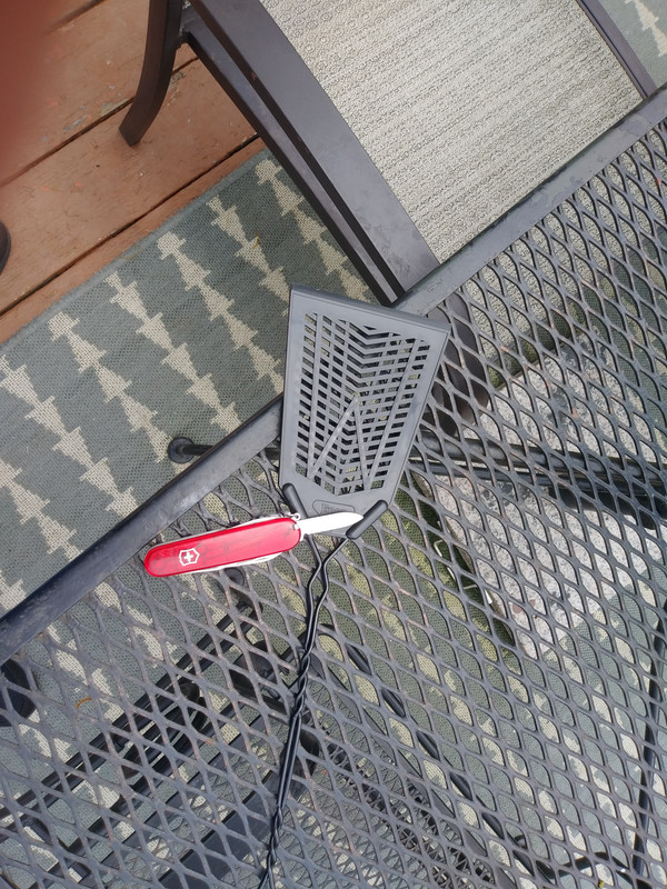Cut the zip ties that held the header card on a new fly swatter. It is said to be "heavy duty", and accordingly was more expensive than a regular one--but was the only one I could find in the store.  The swatter bit is about a quarter-inch thick and made from a tougher black opaque plastic.  The handle is also made from a heavier gauge wire. It seems to be easier to miss with this one than the ordinary $1 swatter.