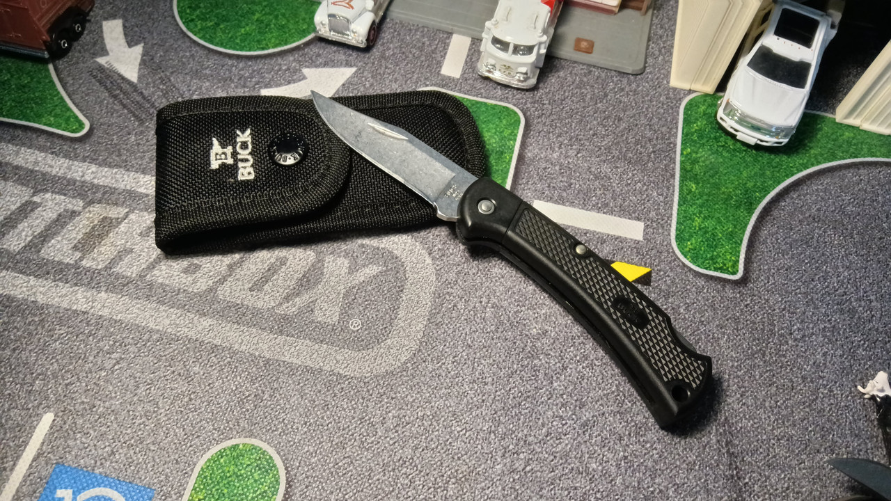 I didn't expect to post so early, but a smoke detector started chirping meaning the battery needed to be replaced (why does it always happen at 1:00 in the morning?) and people were threatening me with heavy, blunt objects if I didn't fix it, so it couldn't wait until morning.  I used the Buck 112 slim pro to pry the old battery out of its compartment.  Sorry the picture is blurry. The light isn't great in the hallway between the bedrooms.