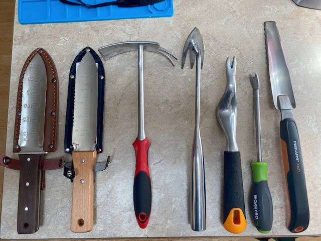 I also have quite a few weeding tools, but my missus is the gardener.  Her favourite weeding tool is a small shovel that I cut back to an almost triangular point and sharpened the edges.  She likes it because it gives her a lot more power than the smaller hand tools, and she doesn't have to bend over so much.