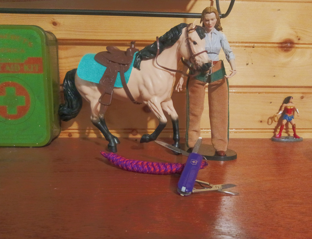 Classic tape cutting scenario.  Classic mini pockie knife.  Roll of plastic tape.  Scissors needed.  Job completed successfully.