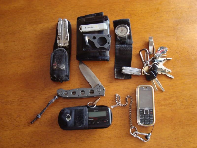 Keys on a regular biner,watch,mp4player,GAK,CT34,and my phone in that brown sheath ot the right . Everything is on my belt  :D :P.