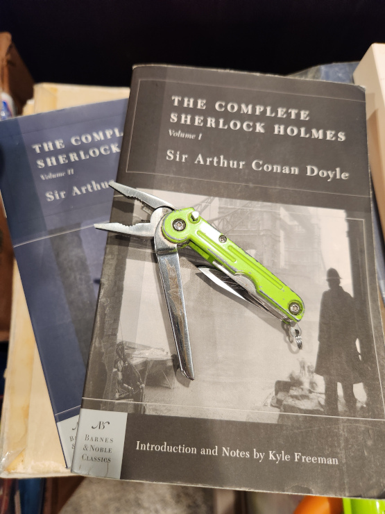Bordering on top large for my keyring is my SOG PowerPint. This is one that I really like. [ Quoting of attachment images from other messages is not allowed ] As for the mini challenge, today, I almost missed it. When we were dating, way back in 79 or early 80, the Boss Lady bought me the 2 volume set of the Annotated Sherlock Holmes, at a local bookstore. I always loved the Holmes stories. [ Quoting of attachment images from other messages is not allowed ] I have kept a copy of the Complete Sherlock Holmes, two versions of the Bible (King James and the ESV) and the Ashley Book Of Knots on my phone through the last 4 or 5 phones that I've had.