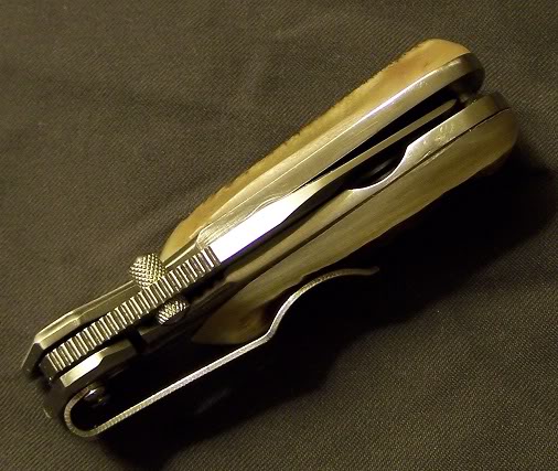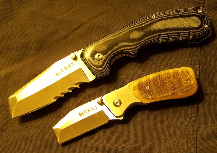 (Image removed from quote.)You can see how thick the handle slabs are, and that they aren't even the full length of the knife. It's comfortable enough in use, but seems really awkward. My hands aren't really sure what to make of it, and I'm not sure the rest of me is any better off.(Image removed from quote.)All in all I really like them- especially the large one!Def