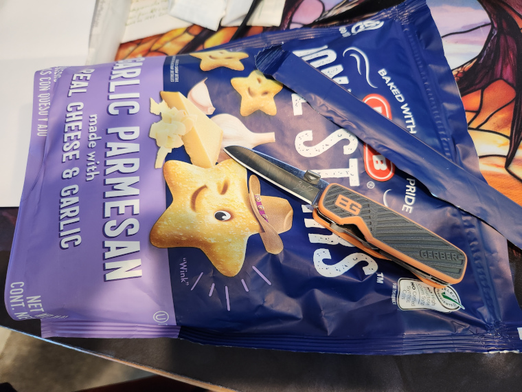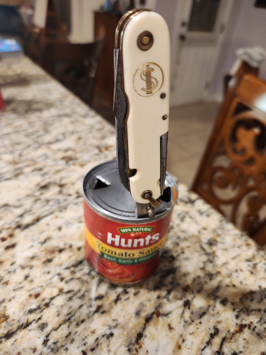 Day 12Finally, some can opener action. [ Quoting of attachment images from other messages is not allowed ] It got the job done. The word I'd use is "arduous." I'm not sure if it's not sharp enough, the hardness is a little off, or it's just a bad design. I had to exert too much force with every cut. Pushing away from myself was even worse than pulling towards myself. Perhaps I'll try it again sometime, but it now stands as one of the worst multi can openers I've tried. And yes, I eat counterfeit Spaghetti-Os for breakfast. [ Quoting of attachment images from other messages is not allowed ] And now for something different... [ Quoting of attachment images from other messages is not allowed ] That is a Schrade 707UH. It measures 2.875" closed, and features a clip point blade, scissors, and an itty-bitty bail. If memory serves my correctly, it wasn't in the line very long, so I'm guessing it wasn't a brisk seller. I also believe it was the only Uncle Henry model with scissors. This one was made in USA; I don't know if it was resurrected after Schrade went bust.