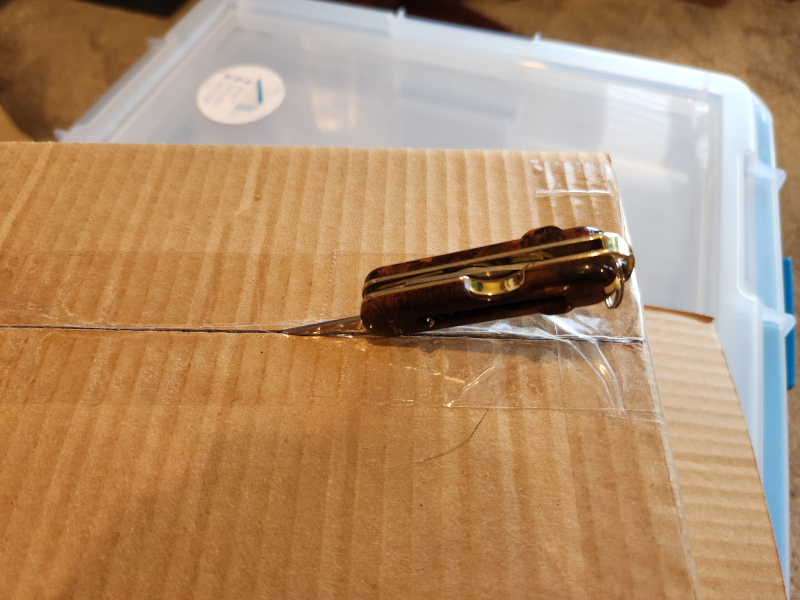 Picture me using the slide out blade on the Gerber Keystyle to break down a box for recycling.  Not the best deployment but it works.