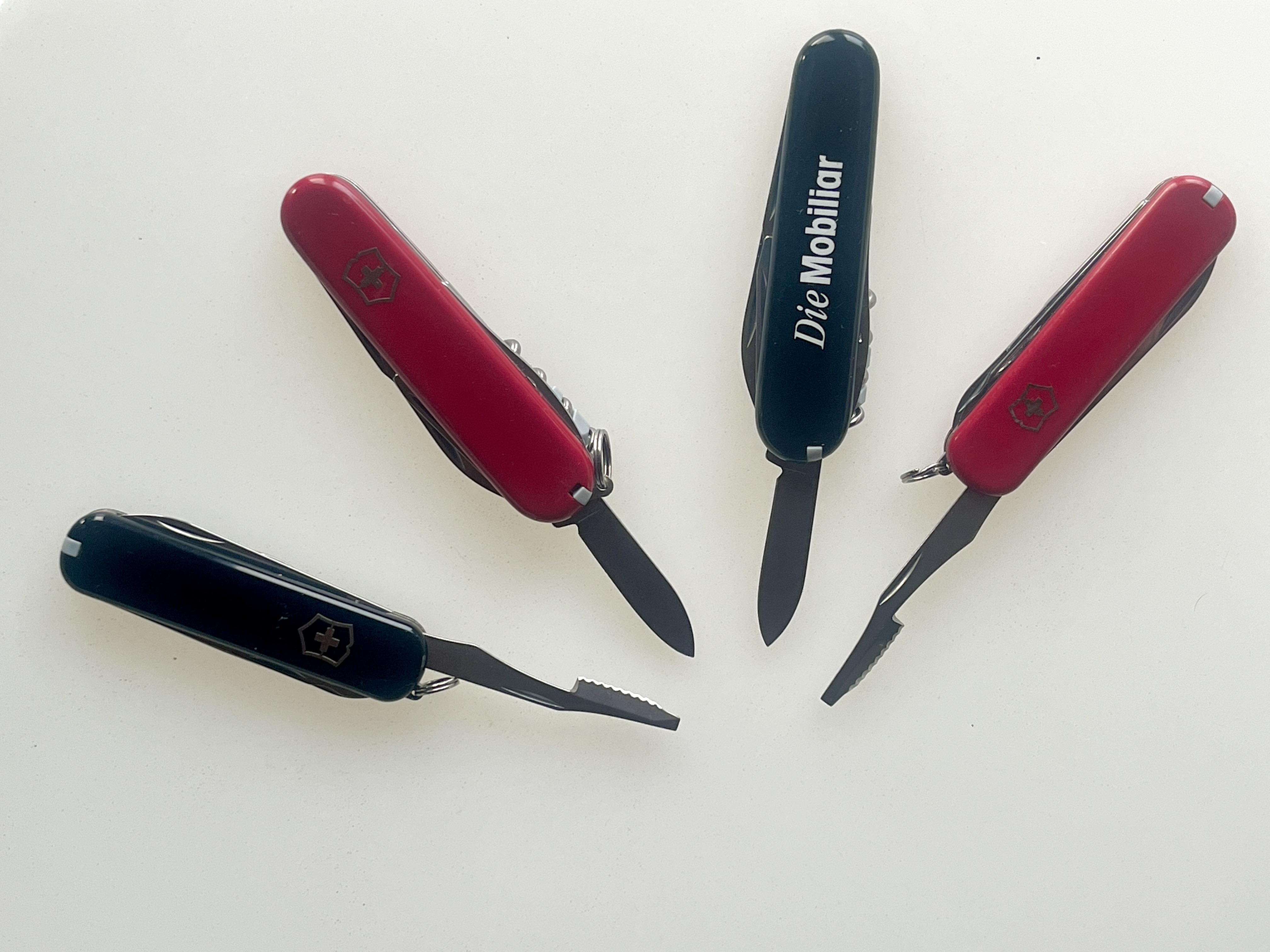 Great stuff, y'awl! Day 30Black and non-black itemsSome Camillus electrician's knives. From left to right: Xcelite-branded and unused, blue ChannelLock Racing, and one that got olive green linen Micarta covers during a rebuild. [ Quoting of attachment images from other messages is not allowed ]