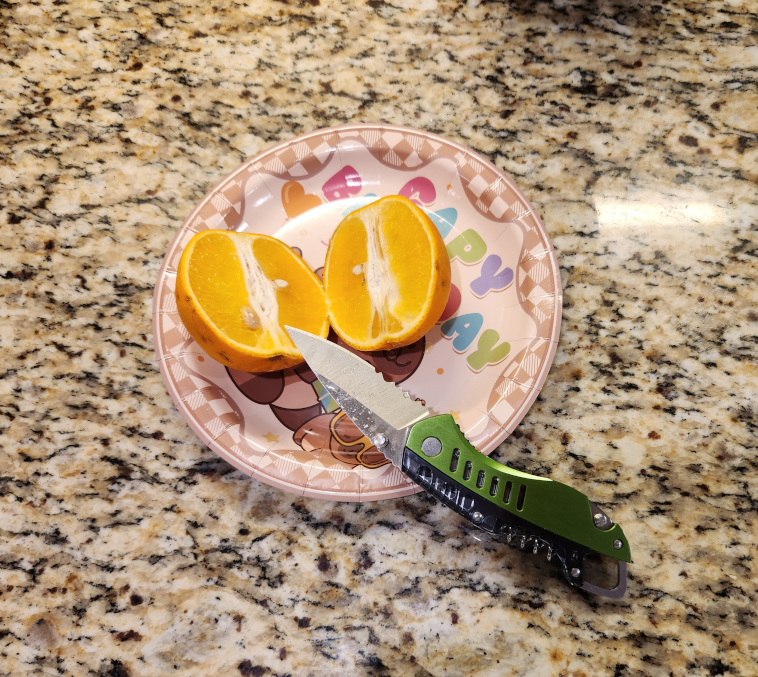 For the natural material I cut into an orange from my dad's orange tree.  Having the PE and SE both on the same blade actually helped.  The PE got me started into the orange and the SE made short work of cutting through the rest.