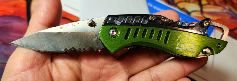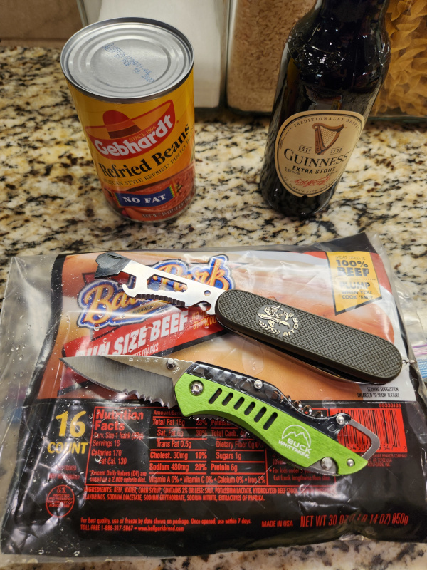 Day 15I thought I was set for the mini-challenge.... I'll pull out the brats I have in the freezer. Nope, apparently I ate those 2 weeks ago. Fine, I'll pull out the baked beans. Nope, those are actually refried beans. No worries, I have put brats and baked beans on the grocery list already.Great... Ok, I can at least pull out a beer. Nope, it's Guinness... oh wait!The Aitor can open the can of beans and can pop open the bottle. My Buck Whittaker 760T kept it company.The Whittaker is pretty to look at but I don't think those half acrylic scales will hold up well. I only carry it every now and then because of it.