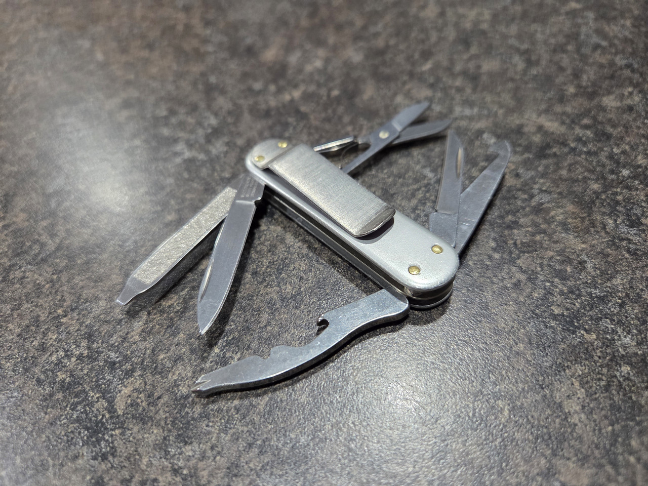 Most recent build. A 58mm with smooth Alox scales and a titanium pocket clip. Toolset is pretty much the same as a Mini Champ, minus the Cuticle Pusher and Ruler (the 2 most useless 58mm tools imo). Anyways, enjoy the pics!