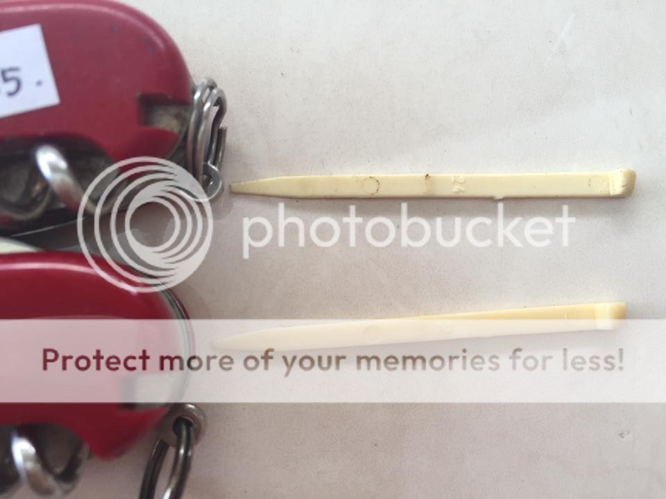 WOW, the saw teeth didn't look right to me which was the first give away.The other thing was something I think I learned from the "SAK owners manual"...the swiss can't bend steel very well...they send it to japan to have made iirc? Anyways the corkscrew shaft and details are way off. at least to me. The T&T I wouldn't give much credit since those are easy to obtain and install as neededThe fact somebody is going through the trouble to make proprietary sized scales.....yeah somebody is putting a lot of effort to rip people off lol.To be honest though if I picked the fake up at a flea market I would have spent a long time going over it as it would just feel "OFF"...but in the end I probably would have picked it up if it was something like $10 or whatever.