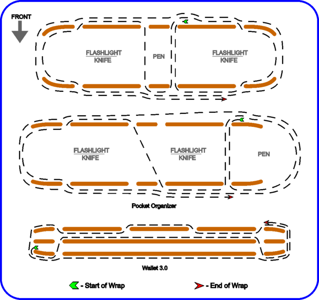 The design layout are two different items, the short leather piece is a pocket organizer folded taco style with the one-wrap threaded thru the slots to make the compartments.