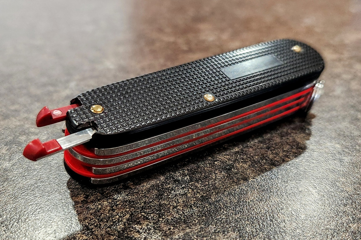 Has the Black Alox Scales with Red G10 Liners. A 93mm Awl was modified (shortened and thinned) to fit in this 84mm knife. Back scale was modified and a custom made layer of Black G10 was made to include the Tweezer and Toothpick. One of the blades was modified into the shape of a Sheepsfoot Blade, used a blade from a 84mm My First Victorinox, the one that's rounded on the end.  Reshaped it, flattened the cutting edge and resharpened.