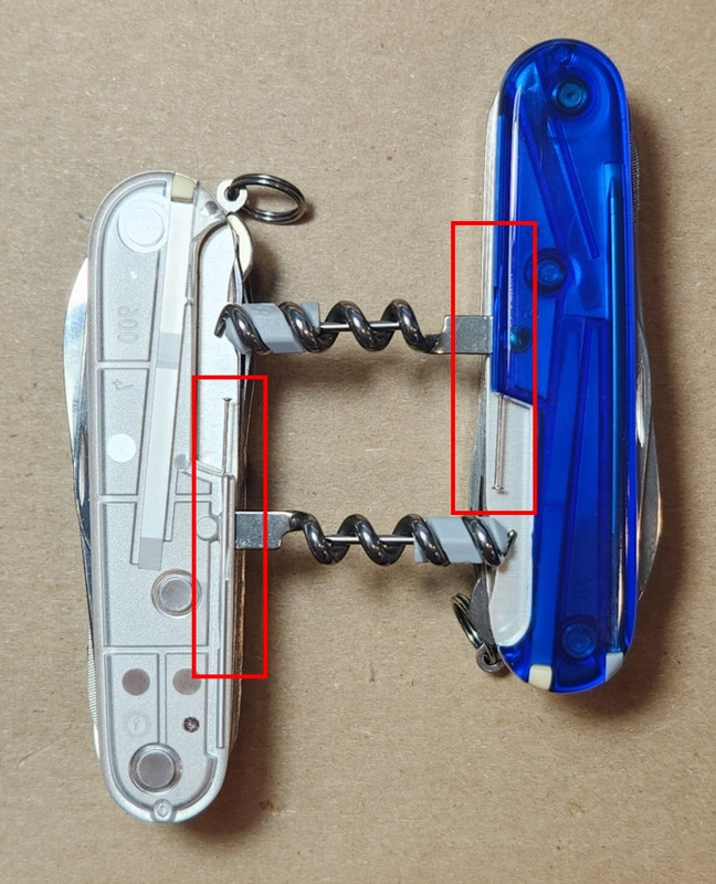 I can't see any checkering using a low powered glass. It looks like your SC has a pinhole with the straight pin in it. Pin, not pen. Did it come with it or did you add it? Mine came with a pin in the hole. Our friend Loop Cutter's came with a pin hole but no pin. I don't know about friend AztecCypher's. You (tuisto) also made a comment about your SAK with camo scales not having a straight pin. According to the Tool Evolution Chart for 91mm, the pin was added to all scales in 2009. That was with a question mark in the chart, since there is always an overlap as the factory uses old stock parts up. Any update is gradual in that sense. SC got the pin added in 1991. Best wishes. G